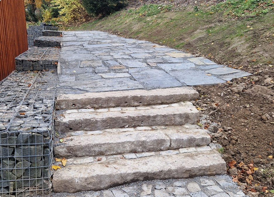 Objednatel: soukromý investorRok realizace: 2025Použitý materiál: žula, čedičRealizované práce: pokládka kamenné dlažby, pokládka žulových schodů